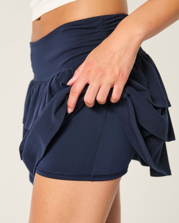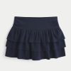 This cute mini skort is designed with a mid-rise waist and features hidden knit shorts with a side phone pocket. Soft and stretchy knit fabric, pretty ruffled tiers. Imported.