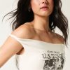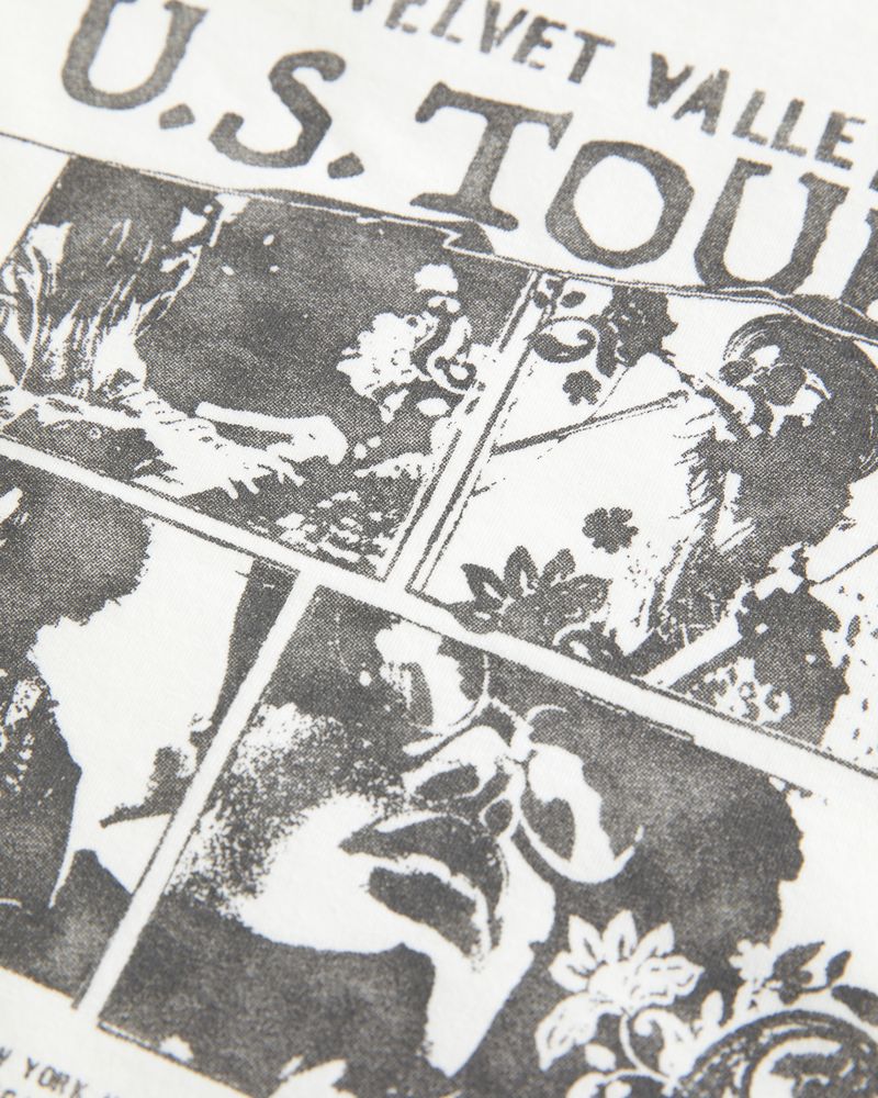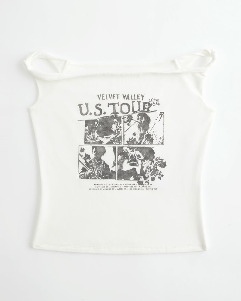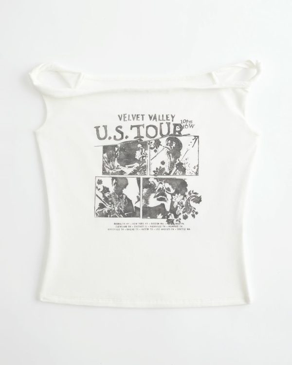 Super soft and comfy, this trend drop tee features a vintage-inspired Velvet Valley US Tour print graphic and twisted off-the-shoulder neckline. Slim Fit. Imported.