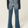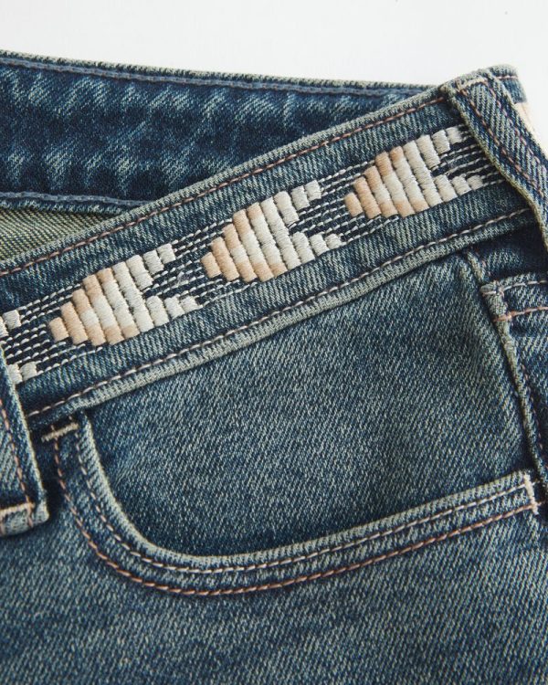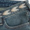 Comfortable jeans in Vintage Stretch denim, designed with an ultra low-rise waist and flared hem. Medium wash with fading and whiskering, embroidered pattern along waistband. Imported.