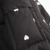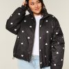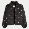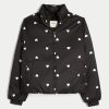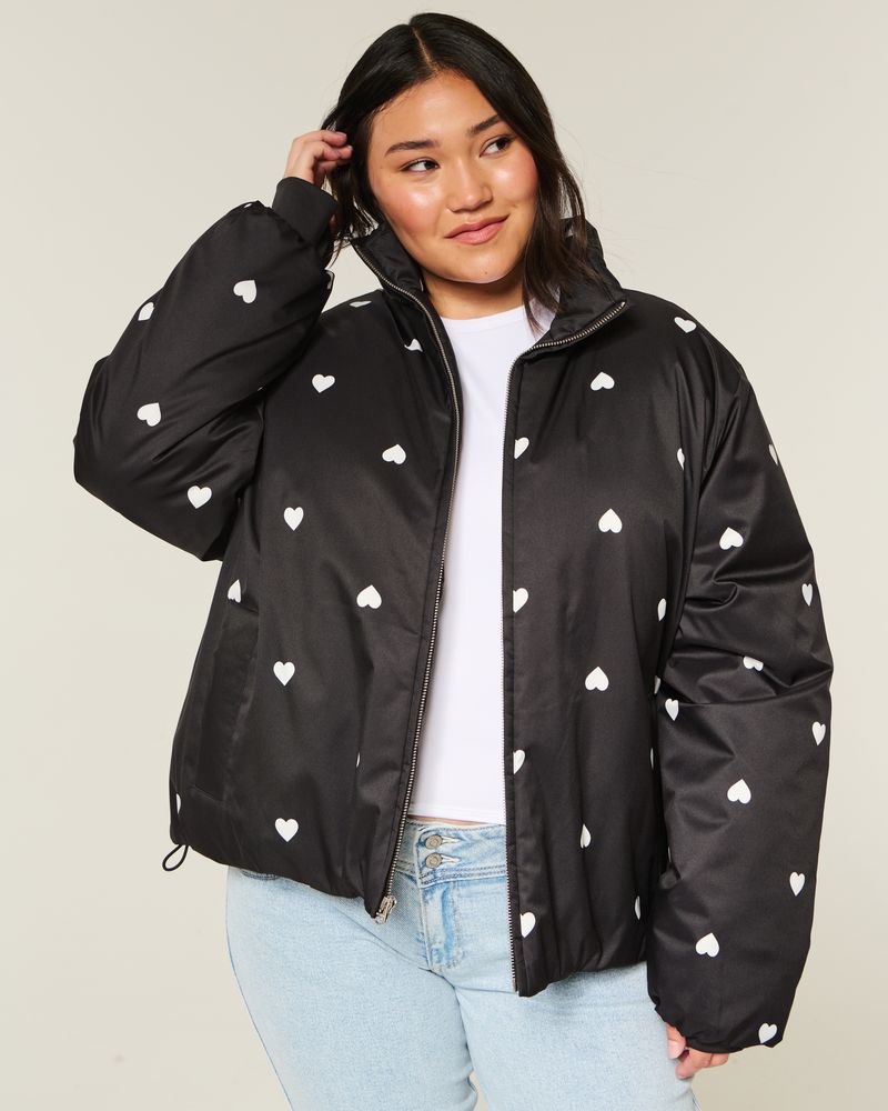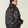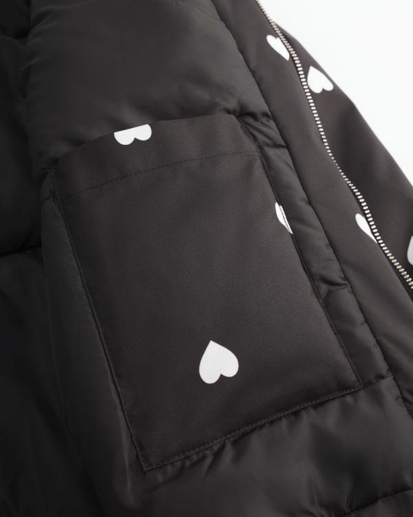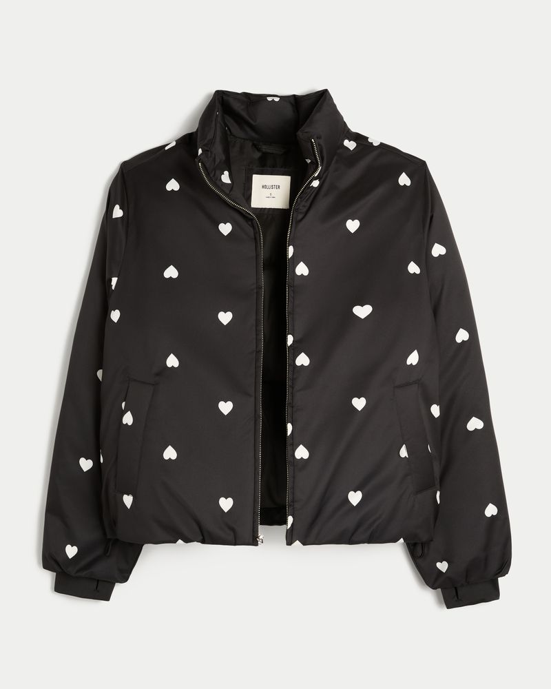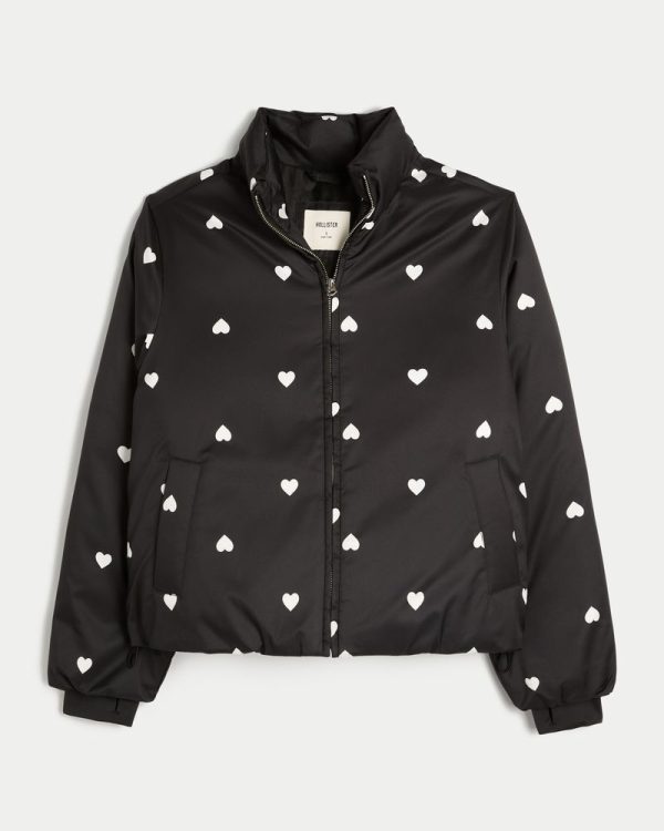 A cozy puffer with a cute pattern and full zip-up closure. Mock-neck collar, interior pocket, adjustable waist bungee, soft storm cuffs with thumb openings, wind and water-resistant exterior. Front pockets. Imported.